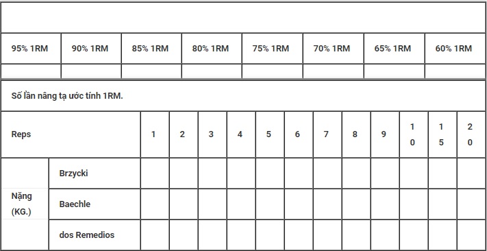 – Brzycki Matt: Trọng lượng tạ/(1.0278-0.0278 * số lần nâng tạ)
