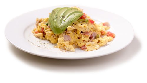 Cho dầu vào chảo, cho hành và cà chua vào xào trước, sau đó cho ít thịt giăm bông vào. Đánh tan 4 quả trứng, thêm chút muối và tiêu, thêm chút sữa. Cho chung vào với hỗn hợp thịt và cà chua ở trên đảo đều đến khi chín. Bày ra dĩa và cắt 1 nửa quả bơ cho lên trên và thưởng thức thôi.