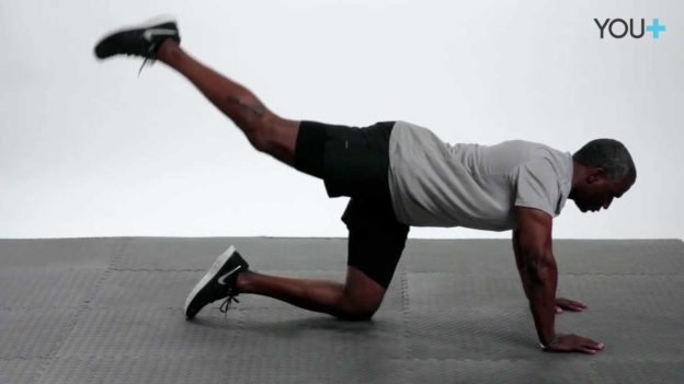 – Giữ lưng duỗi thẳng, căng cứng cơ bụng và mắt nhìn về phía trước. Nhấc gối chân phải lên cho tới khi nào đùi sau thẳng hàng với lưng, gối vẫn cong 90 độ. Thở ra.