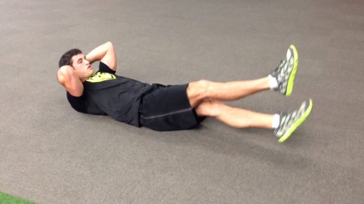 Gập người về phía trước và nâng khuỷu tay lên sang đầu gối đối diện. Mỗi lần thực hiện như vậy là một rep.