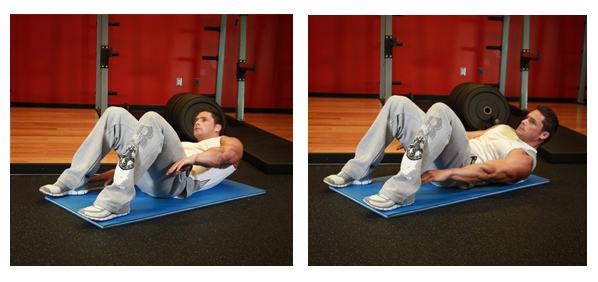 Đặt hai tay ra đằng sau đầu, sau đó nâng phần thân trên lên, gập người về phía trước, đồng thời gập đầu gối bên còn lại lên.