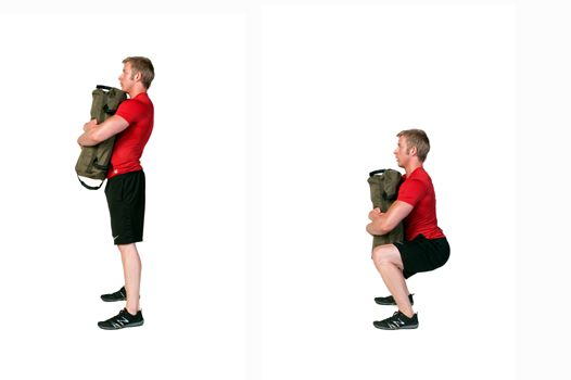 Bài tập gym này sẽ hiệu quả hơn khi bạn di chuyển từ chiều ngang sang chiều dọc. Muốn giữ được sự cân bằng cho cơ thể nhằm tránh xảy ra sự loạng choạng cũng như những sự cố nho nhỏ như vấp té, các bạn nên giữ tư thế 2 chân ngang rộng bằng vai nhé. Tiếp theo các bạn dùng lực của tay để nhấc bao cát lên ngang cằm và thực hiện động tác squat cơ bản. Các bạn cũng nên lưu ý rằng chúng ta hạ thấp với tốc độ chậm nhất có thể trước khi hoàn thành động tác nhé.