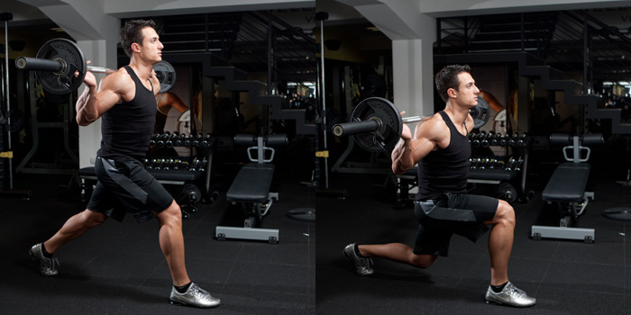 Bắt đầu tương tự như động tác đầu tiên nhưng với tạ barbell đặt tỳ lên phần lưng trên của bạn, hai tay nắm lấy tạ sao cho hai lòng bàn tay hướng về phía trước. Tiếp theo, bước về phía trước sử dụng chân phải và lập tức hạ người xuống tư thế xuống tấn tách với hai đầu gối đều gập cong, đầu gối trái hạ sát sàn tập. Bước người trở về tư thế ban đầu và tập động tác với hai bên đối xứng.