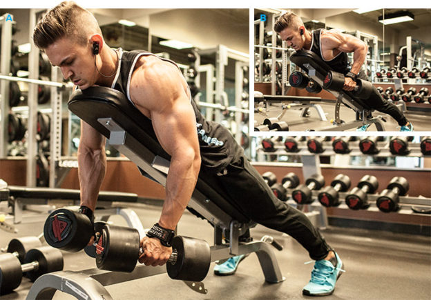 Nằm vào ghế xiên, 2 tay cầm 2 tạ đơn như hình A. Bắt đầu thực hiện, kéo 2 tay đồng thời lên sát người sau đó từ từ thả về vị trí ban đầu. Thực hiện động tác trong 3 hiệp, mỗi hiệp 10 lần.