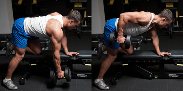 Vào vị trí chuẩn bị như hình A: tay trái, chân trái đặt trên ghế phẳng, chân phải đặt trên sàn và tay phải cầm 1 tạ đơn. Bắt đầu thực hiện, tay phải kéo tạ lên xuống liên tục. Thực hiện động tác trong 3 hiệp, mỗi hiệp 10 lần cho 1 tay.