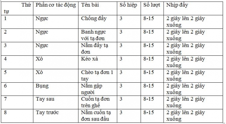 Đối với các bài tập cho thân trên, hãy dành ra khoảng 2-3 buổi/tuần, mỗi buổi khoảng 45 phút. 8 bài tập (cho ngực, xô, tay sau, tay trước và bụng) sau đây đã được chọn lựa kỹ lưỡng để vừa kích thích phát triển vừa an toàn cho cơ thể “teen”. Những bài tập này có phạm vi di chuyển nhỏ và dễ thực hiện giúp tránh những chấn thương không cần thiết.