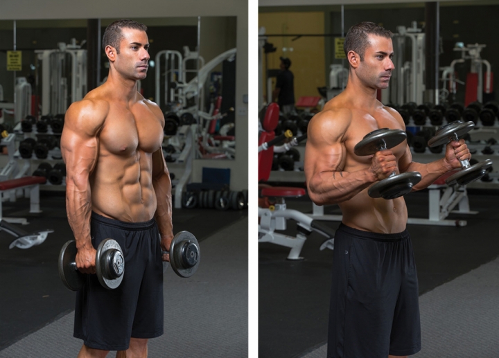 • Đứng chân rộng bằng vai, tay giữ cặp tạ trước đùi.