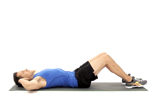 - Nằm ngửa, hai tay đặt sau đầu, 2 khuỷu tay hướng về 2 bên, chân gập và co lên 1 góc 90 độ.
