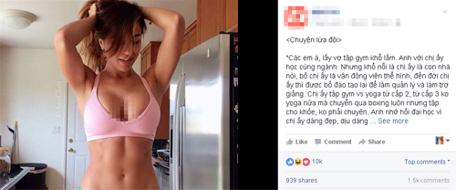 Đây là dòng trạng thái được chia sẻ trên trang Confessions của một trường đại học ở Hà Nội, tâm sự hài hước của một người chồng có vợ thích tập gym nhận được nhiều quan tâm của người đọc. Người chồng trong câu chuyện chia sẻ vì vợ tập gym, quá khỏe, săn chắc và dẻo dai nên sinh ra nhiều tình huống trớ trêu, dở khóc dở cười khiến anh ngượng chín mặt trong cuộc sống gia đình.