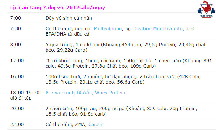 Lịch ăn tăng 75kg với 2612 calo/ngày