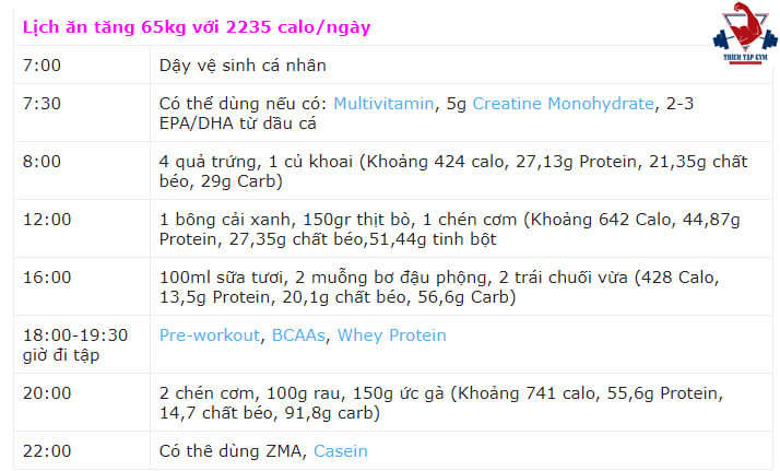 Lịch ăn để tăng 65kg với 2235 calo/ngày
