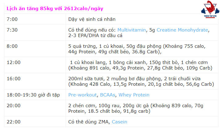 Lịch ăn tăng 85kg với 2612 calo/ngày