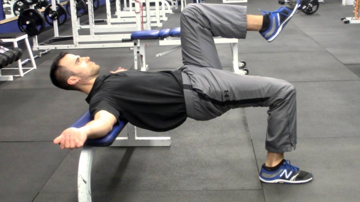Chọn 1 ghế phẳng, nằm nửa lưng lên, 2 tay dang ngang, 2 chân chống xuống đất. Bắt đầu thực hiện động tác: đẩy hông lên cao nhất có thể đồng thời đá 1 chân lên cao sau đó từ từ thả xuống. Tiếp tục nâng hông và đá chân còn lại lên. Thực hiện động tác trong 4 hiệp, mỗi hiệp 6 lần cho mỗi bên.