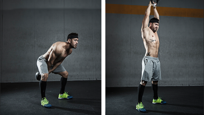 Cầm tạ bằng 2 tay, 2 chân dang rộng hơn vai, hạ trọng tâm và đặt tạ giữa 2 chân. Bắt đầu thực hiện động tác: ném tạ cao lên qua đầu đồng thời đứng thẳng dậy. Sau đó thả về, hạ trọng tâm. Thực hiện động tác trong 3 hiệp, mỗi hiệp 12 lần.